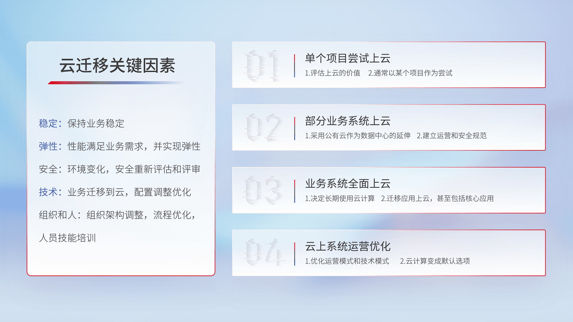 结合实际业务,,,,从规划设计、、、、云平台选型、、、、云原生改造、、、、数据迁移、、、、集成交付,,,,迁移全过程为客户识别最佳上云路径,,,做好风险识别管理,,设计网络架构、、身份权限、、安全审计合规、、、操作审计、、日志审计、、监控告警策略、、、多站点容灾设计等,,,,对云上基础设施进行整体规划,,,,提升IT治理水平,,,以满足弹性、、高可用、、、、高性能的需求。。。
