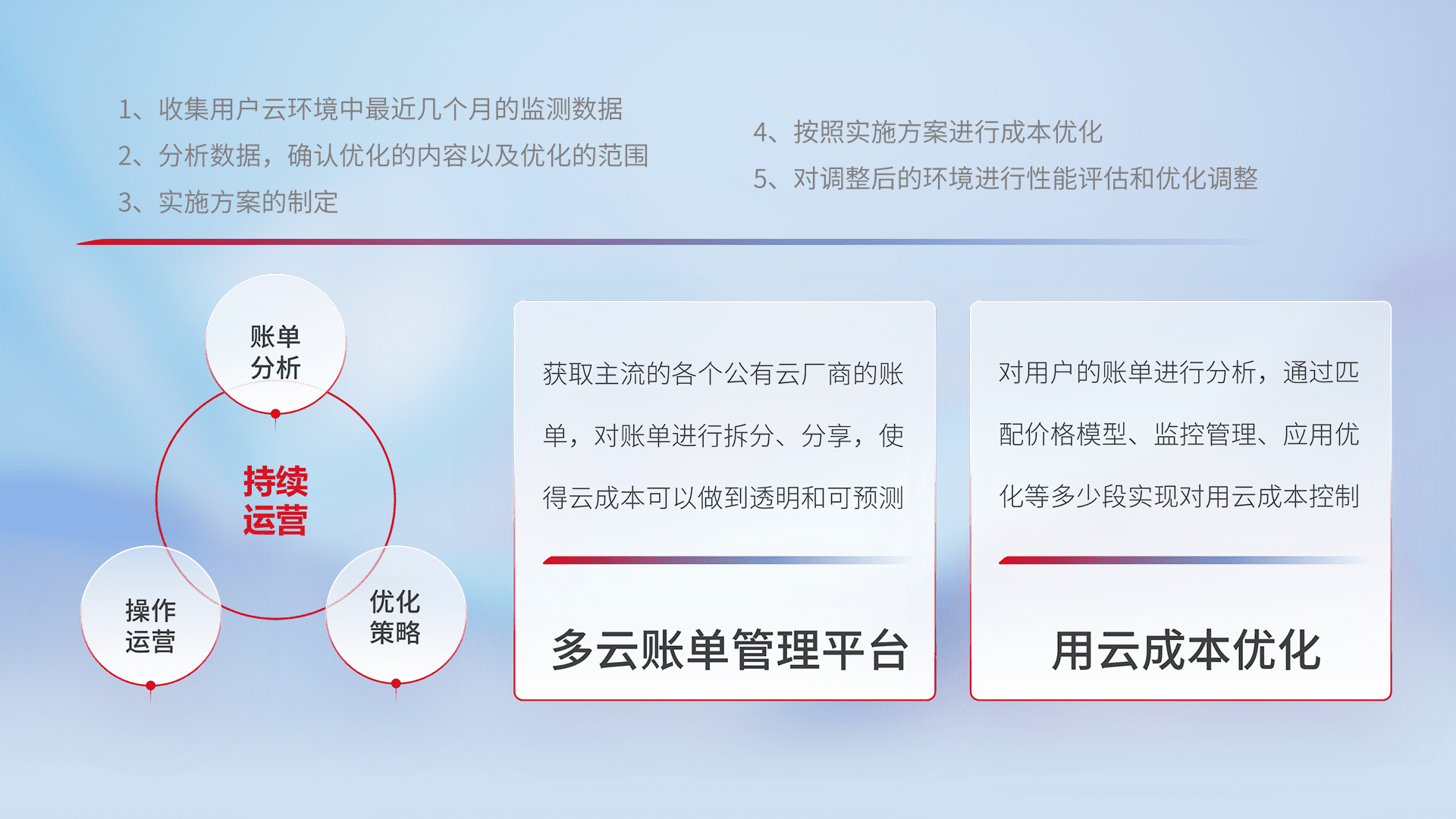 通过多云纳管,,,,以统一的资源数据模型把客户的云资源进行抽象和封装,,,,进而实现对多云资源的统一操作,,,保障云资源管理的可靠性、、、、稳定性与可用性。。。量身定制化运维内容,,,配置、、、、开发运维、、、补丁管理、、备份、、、、监控、、认证和访问管理、、、、审计和日常巡检等,,,保障在用云过程中的可靠度,,,稳定度以及高可用率。。。